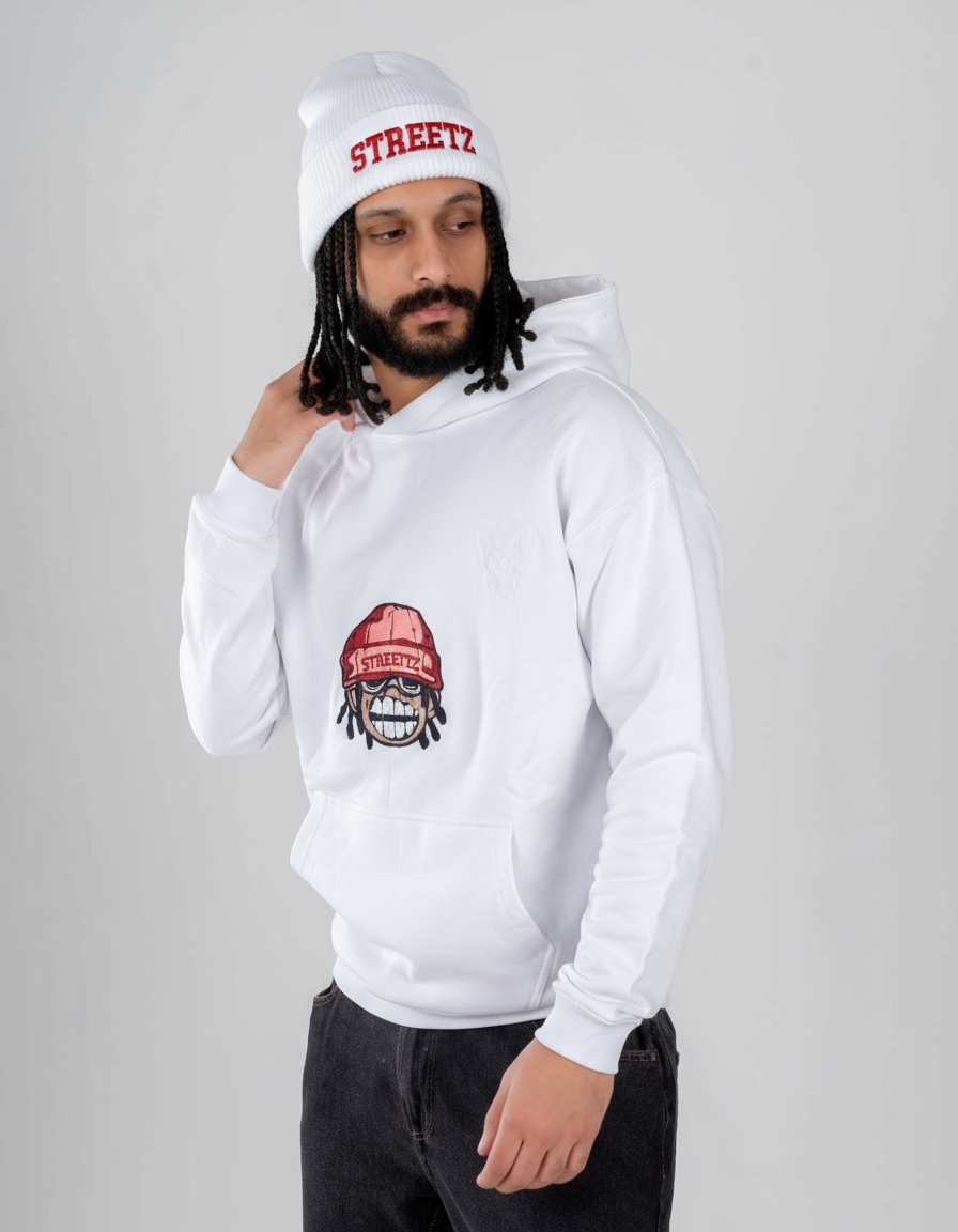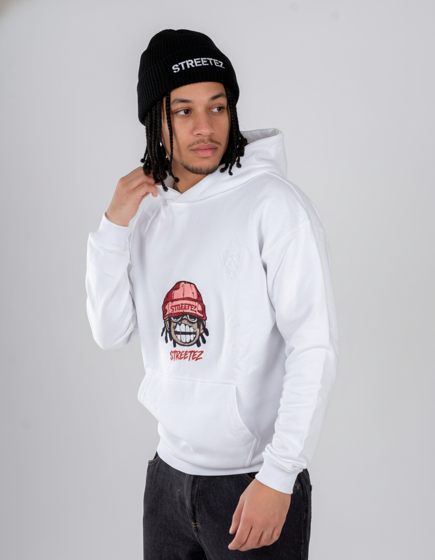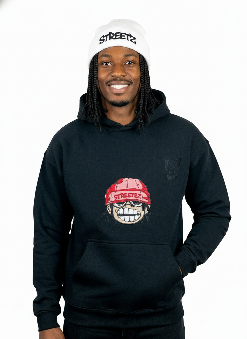 Streetez hoodie embroidered design of A character called HOSS he is a man from the hood that is trying to make it to the top 1% so be like HOSS .